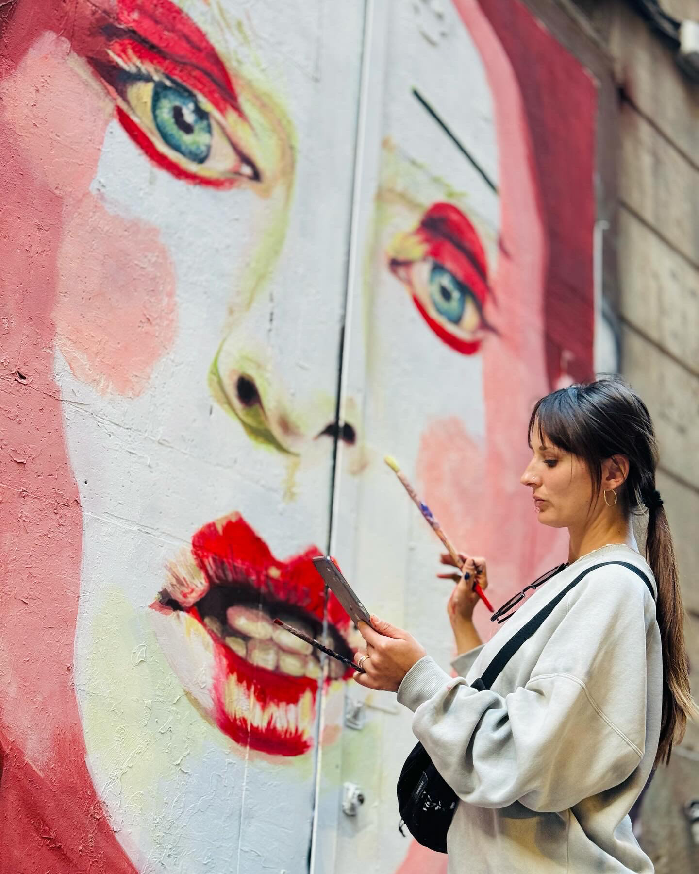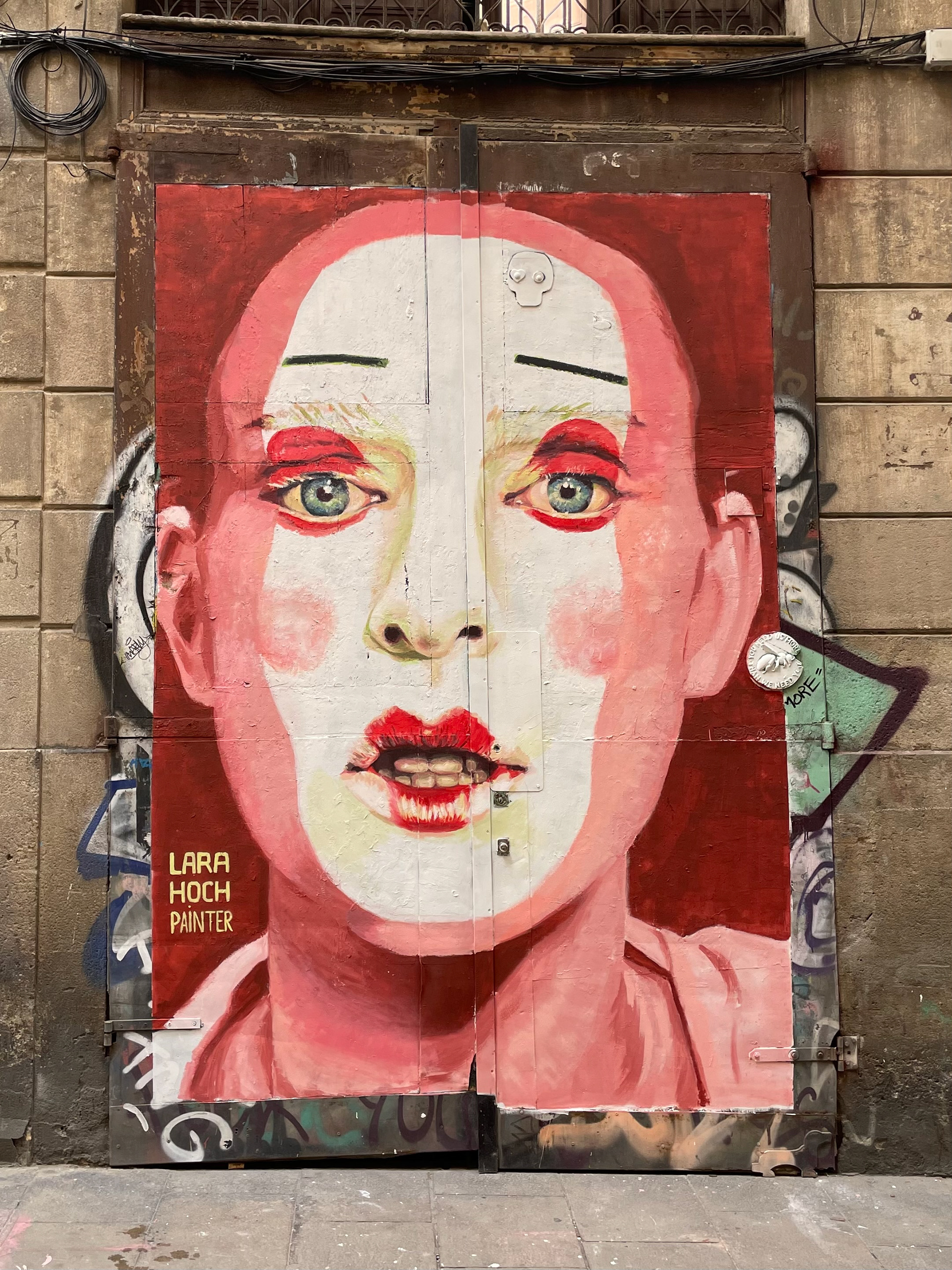 this mural was painted with acrylics and wall paint on a wooden door in the streets of gotico in Barcelona